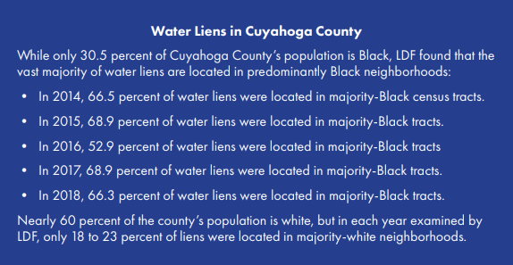 Ohio residents who fail to pay their water or sewer bills may have their service terminated or have a lien placed on their homes for the amounts due. Twice a year, in September and March, Cleveland Water has the ability to place liens for outstanding debt with the county where water service is provided. While there does not appear to be any statutory minimum amount of arrears required for this process to be initiated, Cleveland Water has informed local advocates that it requires the customer to have at least $300 in arrears over a six-month period and requires the customer to be disconnected from service. If the homeowner pays the amount due, the lien is immediately released.
